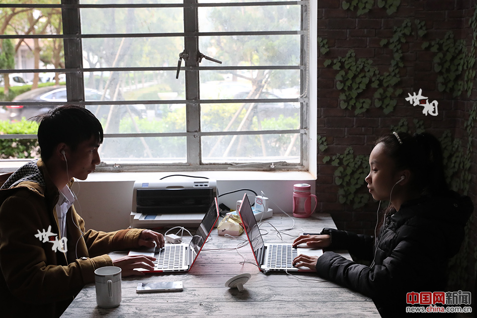 小黄(画面右)和小尤在安静的办公室里回复网友提问。小尤来自台州,18岁时他意外致盲,如今尚存部分视觉。