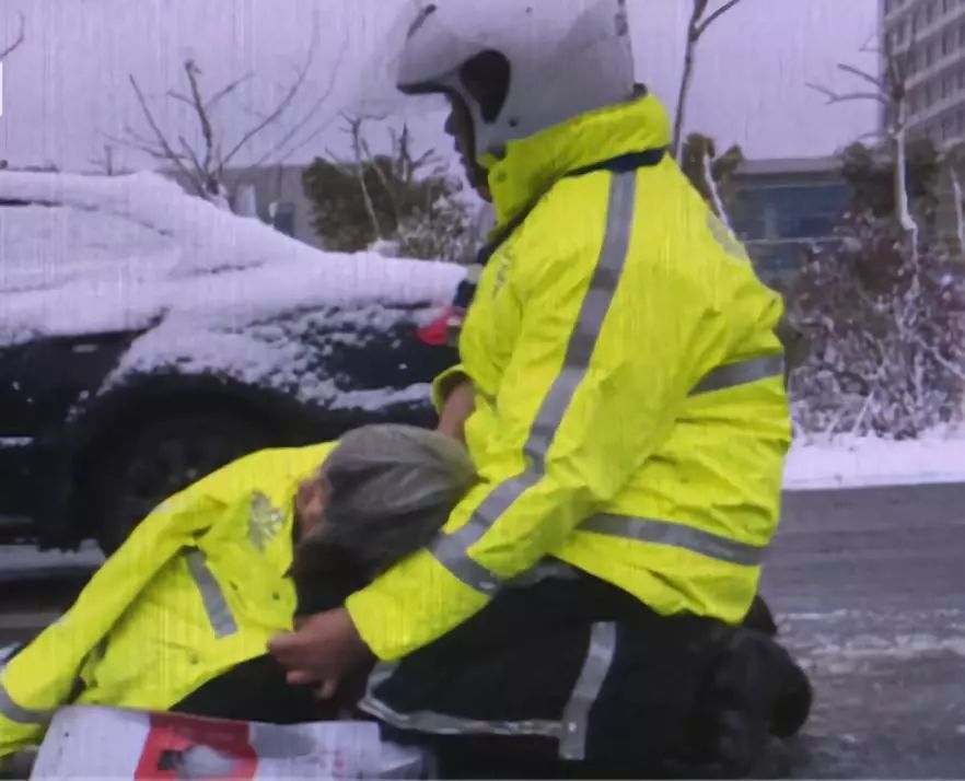 今年1月,一位老人倒在结冰的马路上,一名交警脱下自己的大衣盖在老人身上,双膝跪地托着老人的上半身,让老人能够躺在他怀中。而他的另一只手紧紧拉着大衣衣角,以免大衣从老人身上滑落。