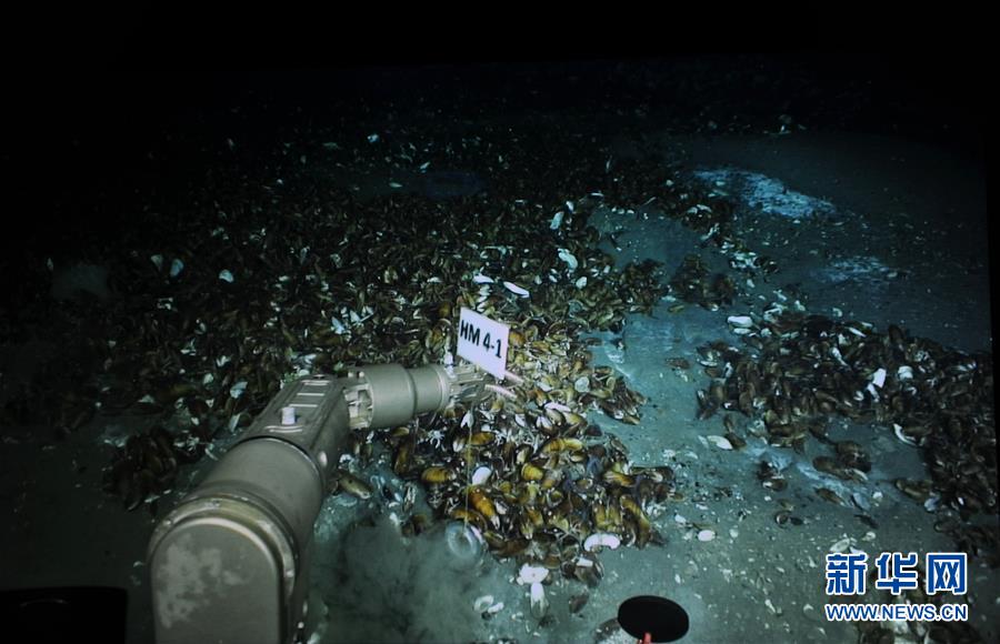 新华社“探索一号”5月21日电(记者张建松)灯光的照射下,海底幽蓝静寂、海雪飞扬。一串串珍珠般白色气泡,不停地从海底汩汩冒出来。气泡周边,满眼的贻贝、蛤类和蚌类等密密麻麻;半透明的阿尔文虾、白色的铠甲虾、一簇簇管状蠕虫,一片片小蛇尾等随处可见。
