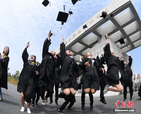 大学生在校园内拍摄花式毕业照。 赵春亮 摄