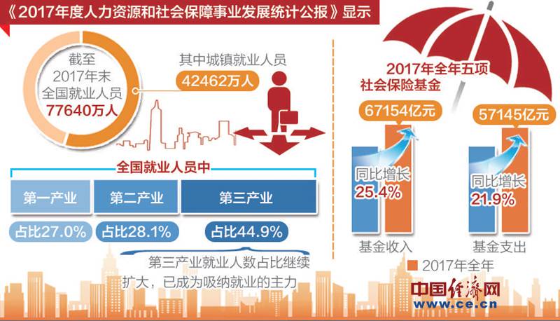 5月21日,人力资源和社会保障部发布《2017年度人力资源和社会保障事业发展统计公报》。《公报》显示,截至2017年末,全国就业人员77640万人,比上年末增加37万人。其中城镇就业人员42462万人,比上年末增加1034万人。就业形势保持稳定。