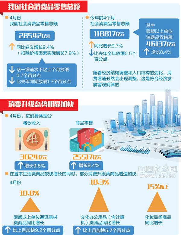 近日,国家统计局发布的数据显示,4月份,我国社会消费品零售总额28542亿元,同比名义增长9.4%(扣除价格因素实际增长7.9%)。这一增速水平比上个月放缓0.7个百分点,比去年同期放缓1.3个百分点。