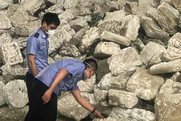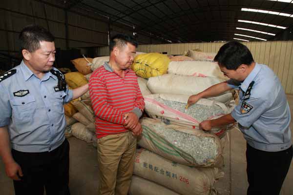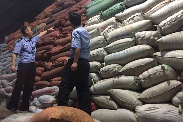 图为:昆明海关缉私警察在仓库清点查扣固体废物