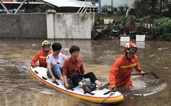 2018年5月7日,在积水严重的厦门市思明区东坪山路,消防官兵转移被困人员。来源:新华网