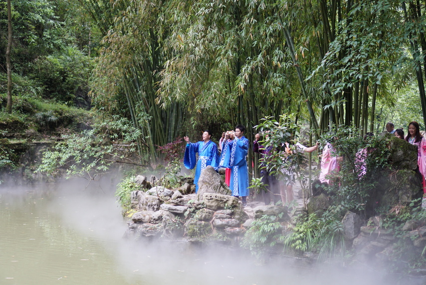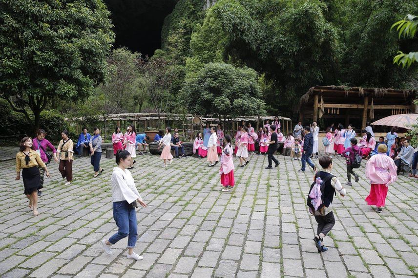 桃花源景区最大的特色就是古装穿越体验,游客可在景区入园处换装秦晋袍衣褶裙,入院后,一应吃穿用度、生活起居、建筑风貌、丝竹器乐均以秦时为例,让人充分感受秦人、秦俗、秦貌、秦趣等古风古韵,走进2000多年前的秦人村落。百家网媒记者就地换装,秦衣晋袍加身,置身青山绿水、桃花掩映之中,释放自由,寻找精神原乡。