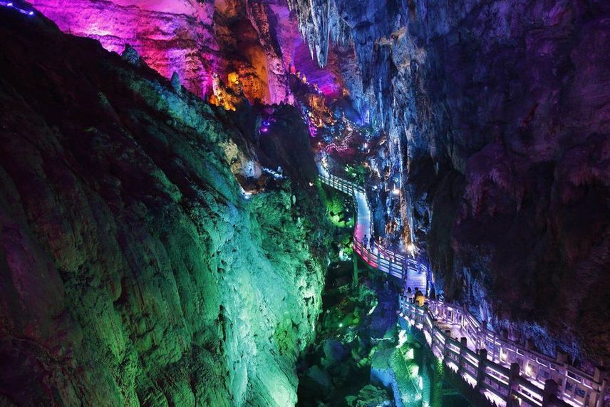 目前景区由太古洞、世外桃源两大部分组成核心区域。太古洞,洞内钟乳挺拔,石笋丛生,石幔高挂,石柱巍峨,经过灯饰精心点缀的溶洞,五彩缤纷,如梦似幻,堪称“地下桃花源”。而世外桃源区域则紧紧围绕“桃源梦境”主题进行布景。游客可一边默念《桃花源记》,一边体验“晋太元中”武陵渔人发现桃花源的“神奇之旅”。