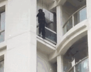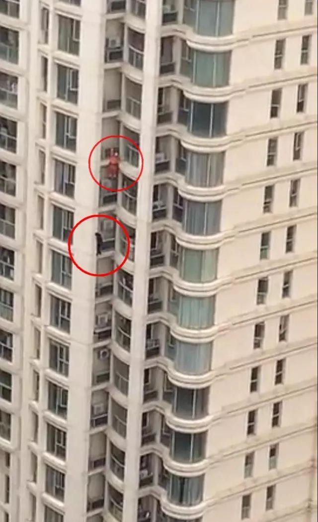 这时,准备就绪的消防官兵从18楼快速滑绳下来,一把死死抱住男孩,往护栏内的安全区域拖拽。