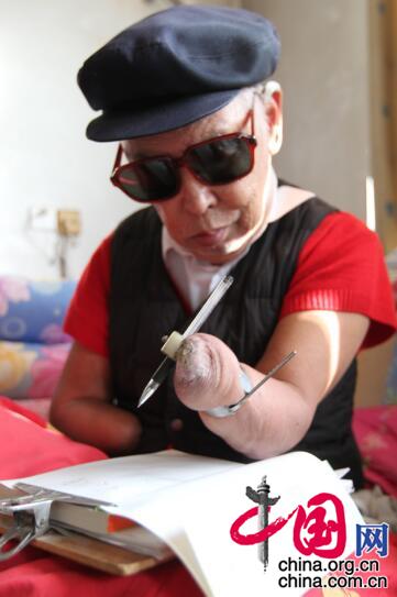 1987年,在专程来看望的迟浩田将军鼓励下,父亲终于拿起了笔。他让母亲把被子叠成“方块”,垫在大腿上,再把写字板放在被子上,弓背低头,用嘴含着笔尝试写字。口水顺着笔柄往下流,浸湿了稿纸,换一张重新写!开始每天只能写十几个字。后来由于长期弯腰弓背,父亲头晕目眩,各处伤口的神经疼痛难忍,似乎又经历了一次次手术的痛苦。