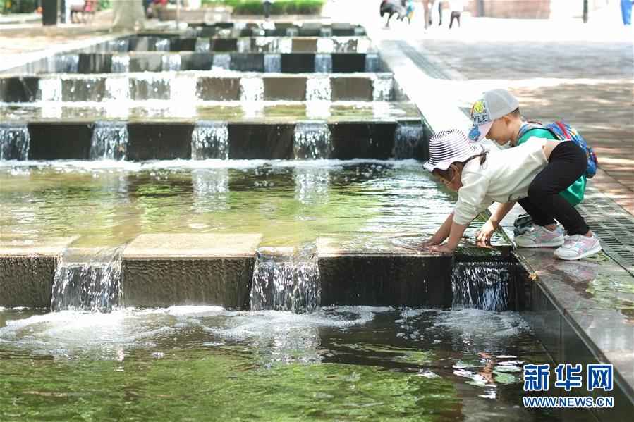 5月23日,小朋友在青岛老舍公园戏水玩耍。新华社记者张铖摄