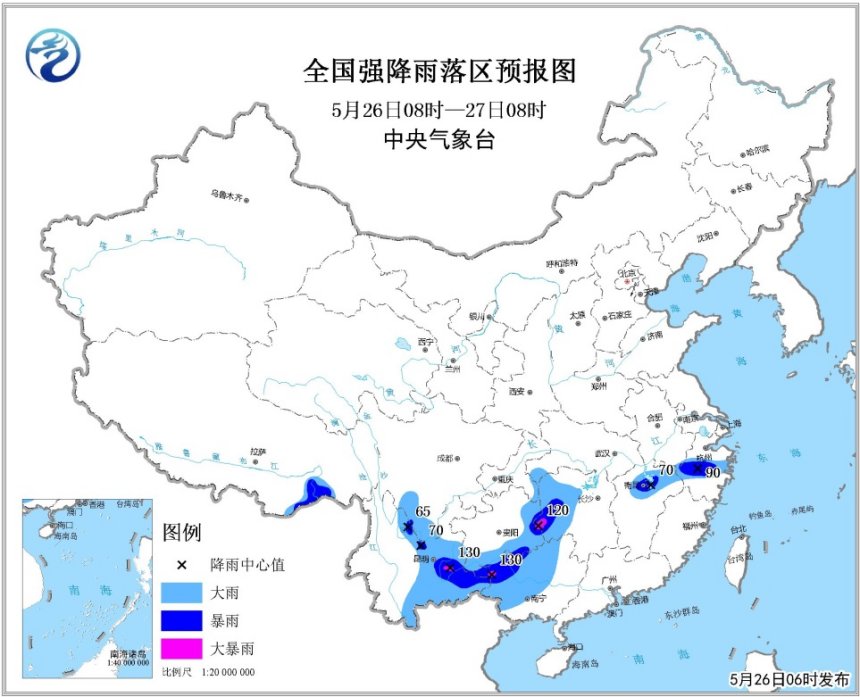 中央气象台预计,26日8时至27日8时,浙江中部、江西北部、湖南西部、贵州东部和南部、广西中西部、云南东部和南部、四川南部等地的部分地区有大到暴雨,其中,湖南西南部、贵州东部、广西西北部、云南东部局地有大暴雨(100~130毫米)。