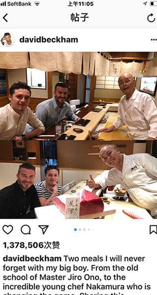 贝克汉姆在Instagram投稿与“寿司之神”合影