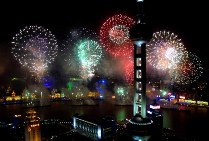 焰火在上海黄浦江畔绽放(2001年10月20日摄)。新华社记者 陈飞 摄