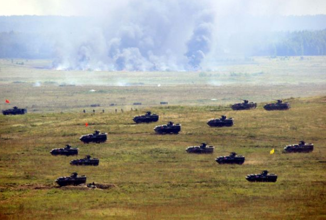 2007年8月17日,在俄罗斯车里雅宾斯克举行的“和平使命—2007”上海合作组织成员国联合反恐军事演习实兵演练中,中方重型突击装备向“恐怖武装”发起总攻。新华社记者 李刚 摄