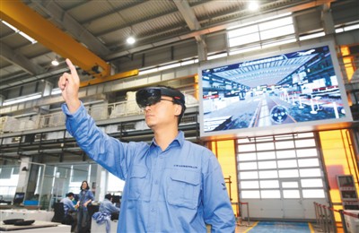 工作人员在中国商飞公司总装制造中心使用AR眼镜操控虚拟电子屏幕。 新华社记者 丁 汀摄