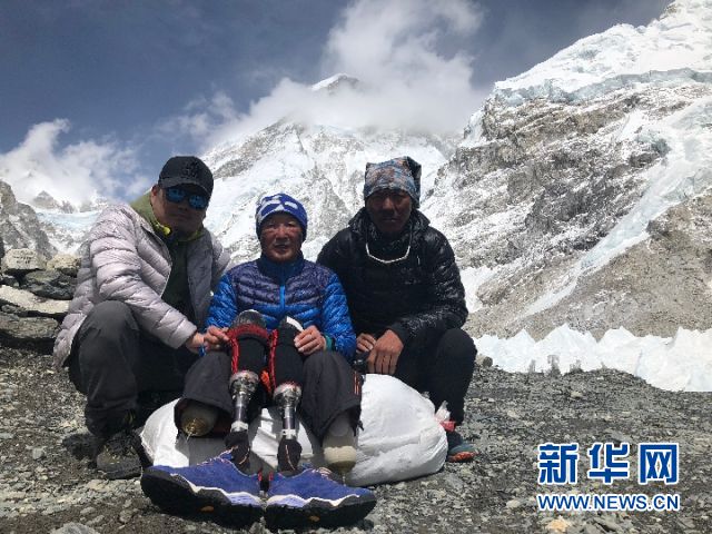 从珠穆朗玛峰南坡大本营出发,经过7天跋涉,5月14日,69岁的夏伯渝,穿戴义肢,终于站在世界最高峰的顶端。