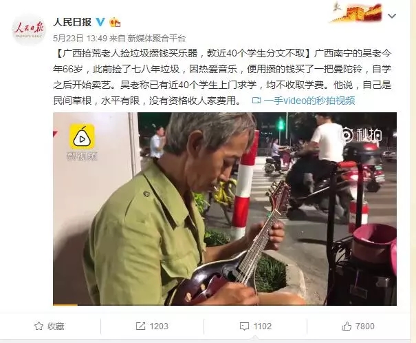 近日,人民日报微博推送了南宁拾荒老人的相关视频,获得无数网友点赞!