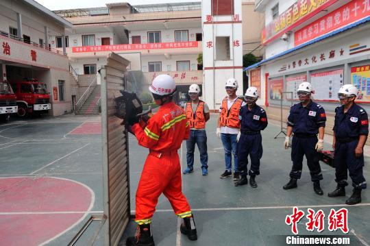 武警广西百色市消防支队右江大队右江中队官兵向蓝天救援队志愿者传授无齿锯破拆技术。 蒋雪林 摄