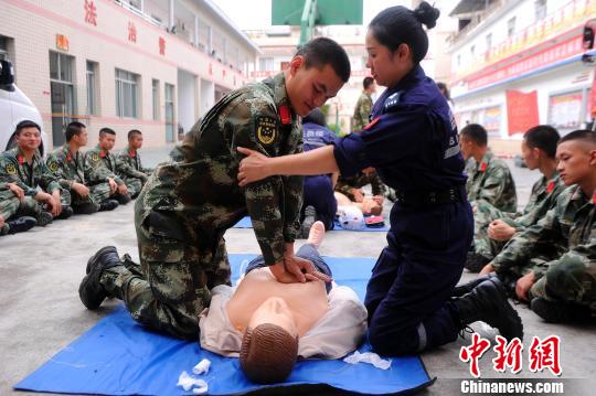 蓝天救援队志愿者向武警百色市消防支队右江大队右江中队官兵传授心肺复苏术。 蒋雪林 摄