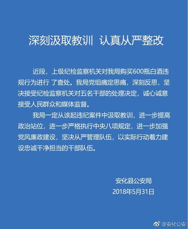 2017年12月18日,湖南省纪委收到反映安化县公安局违规采购、消费白酒问题的网络举报。调查发现,2016年6月,安化县公安局违规从贵州省仁怀市茅台镇采购了600瓶白酒。今日,安化县公安局对此事进行回应,坚决接受纪检监察机关对五名干部的处理,以下为回应全文: