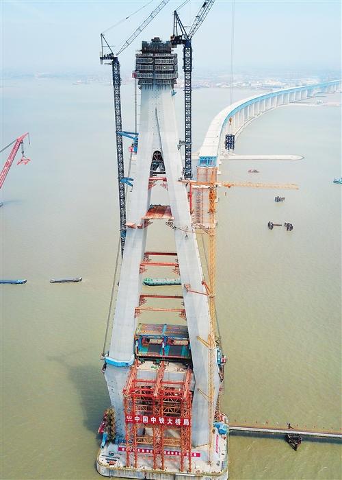 正在建设中的沪通长江大桥主航道桥。大桥建成后,将成为长三角地区沿海重要的铁路、公路过江通道。 许丛军摄(新华社发)