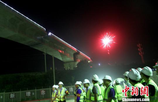 图为6月1日零时57分,连淮扬镇铁路首座转体桥跨越宁启铁路完成“转体”。 崔佳明 摄