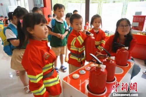 资料图:儿童节孩子们穿上迷你消防服,体验模拟灭火。 韩章云摄