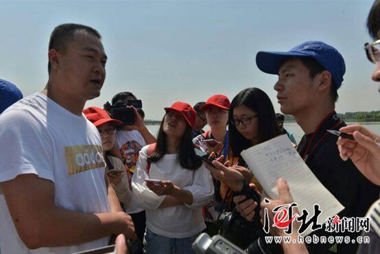 6月1日,“水到渠成共发展”媒体采访团一行来到石家庄滹沱河。图为河北省水务集团建管处副处长马建超向采访团介绍情况。邱骥摄