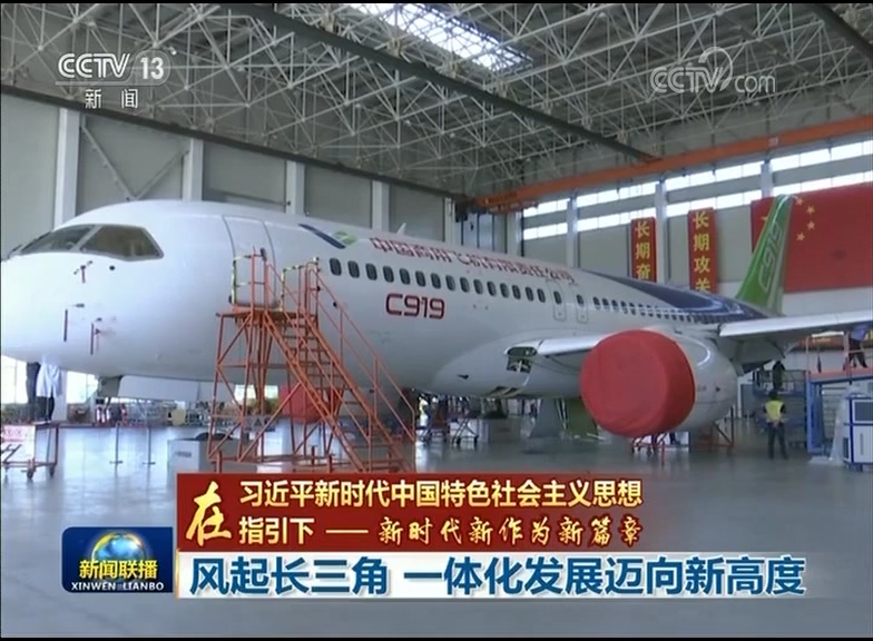如今,长三角各领域的融合正不断深入。经济合作上,从最初的产业、贸易分工,正逐步转向要素、价值链分工。这架正在总装的C919客机,在长三角苏浙皖三省都有零部件供应商,江苏镇江还专门建设了航空航天产业园。