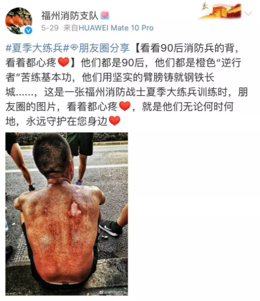 微博中的图片是一位90后消防兵的后背,看起来已经“晒焦了”,微博配文: