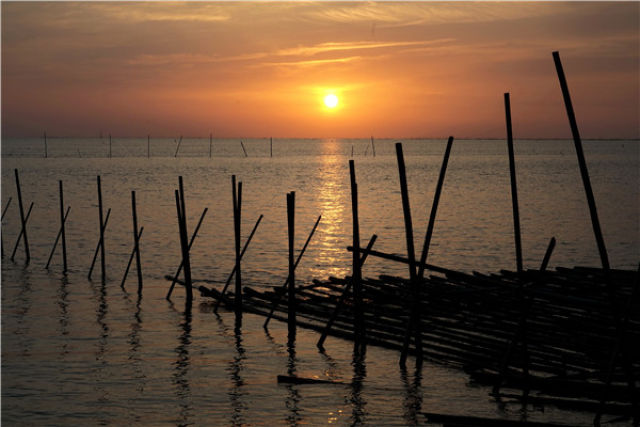 ↑台湾嘉义县东石村连片的蚵架形成的“海田”被余晖浸染的景色(4月9日摄)。新华社记者林善传摄