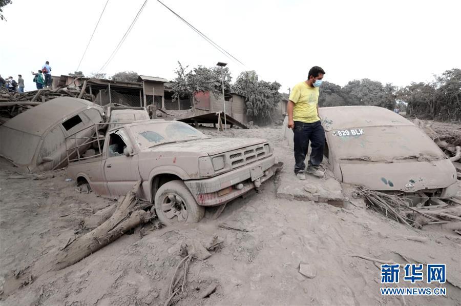 6月4日,在危地马拉埃斯昆特拉省圣米格尔洛斯卢特斯,一名男子走过被火山灰覆盖的汽车。危地马拉国家自然灾害协调机构4日说,富埃戈火山喷发遇难人数目前已上升至33人,伤者达到46人,受灾人口已超过170万人。位于危地马拉首都危地马拉城西南约40公里的富埃戈火山3日猛烈喷发。新华社发