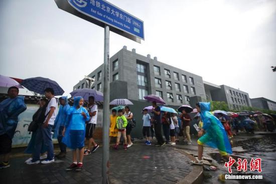 8月12日,游客冒雨在清华大学校门外排队等候入校参观。暑假以来,不少游客带着子女蜂拥至北京大学、清华大学等高校,一睹中国最高学府的风采。中新社记者 贾天勇 摄