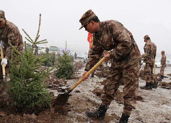 为保护三江源生态环境,玉树骑兵连官兵数十年如一日,扛铁锹、抬树苗、上荒山、入牧区,在训练执勤之余播种绿色。