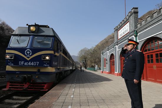 2018年4月10日上午9点,万里无云,八达岭山间仍然留有冬天的凛冽寒意。青龙桥车站站台上,杨存信笔直地站着。他穿着深蓝色的制服,左手贴着裤缝,右手抬到眉间,敬了个端正的礼。