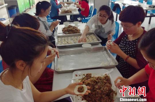 老师们将祝福包进饺子里,希望孩子们金榜题名。孙圣雅摄