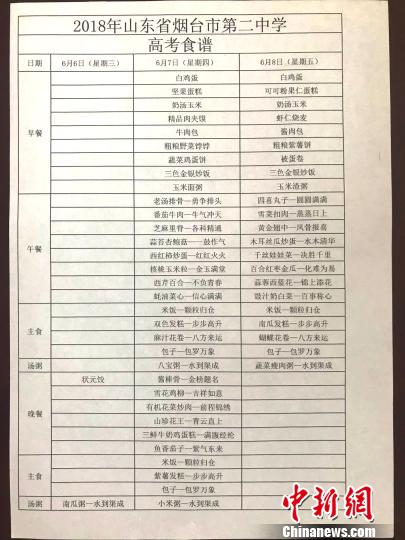 高考期间,该校还为考生提供早中晚“特色祝福高考餐”,食堂师傅们不仅在饭菜健康营养、种类口感上下功夫,在菜品的名字上也是用足了心思,“勇争排头”(老汤排骨)、“牛气冲天”(番茄牛肉)、“各科精通”(芝麻里脊)、“信心满满”(蚝油菜心)、“不负青春”(西芹百合)等出现在菜单中。 孙圣雅摄