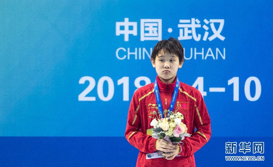↑6月6日,张家齐在颁奖仪式上。当日,在武汉进行的第21届国际泳联跳水世界杯女子十米跳台决赛中,中国选手张家齐以427.30分的总成绩夺冠。新华社记者熊琦摄