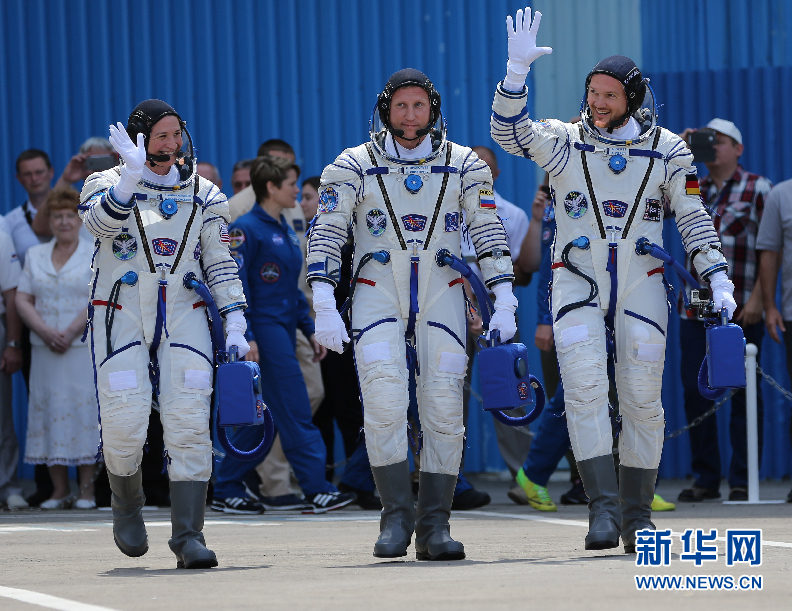 飞船发射前穿着宇航服的俄罗斯宇航员谢尔盖普罗科皮耶夫、美国宇航员塞雷纳 埃农和德国女宇航员亚历山大 格尔斯特。新华网发 米赫耶夫摄