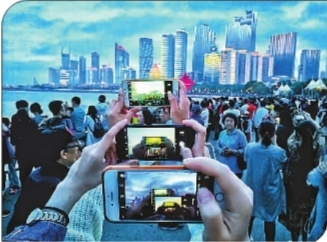 夜幕下的青岛灯光璀璨,游客用手机拍摄浮山湾夜景。新华社发