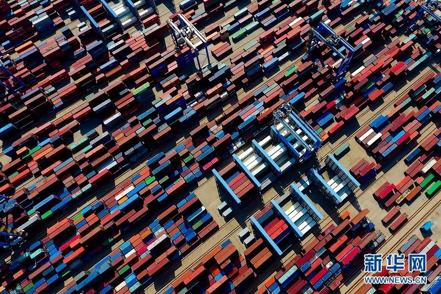 青岛港前湾自动化集装箱码头堆放的集装箱。新华社记者 李紫恒摄