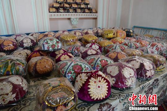阿瓦古丽的合作社制作的部分手工花帽。 勉征 摄