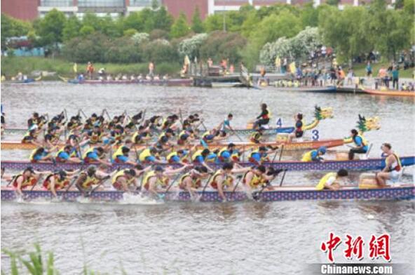 沪上千余名外国留学生通海湖上赛龙舟。 朱鹏 摄