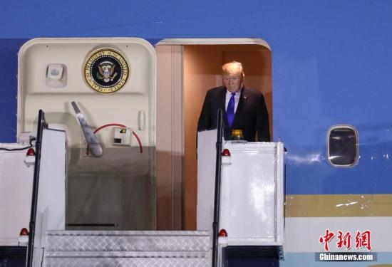 美国总统特朗普于当地时间6月10日晚乘坐“空军一号”专机抵达新加坡巴耶利峇空军基地。(中新社记者 刘震 摄)