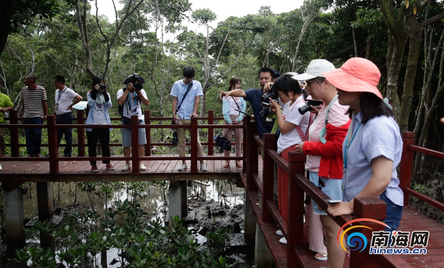 参加“新时代·幸福美丽新边疆”海南行网络主题采访活动记者在海口东寨港红树林国家级自然保护区采访。南海网记者刘洋 摄