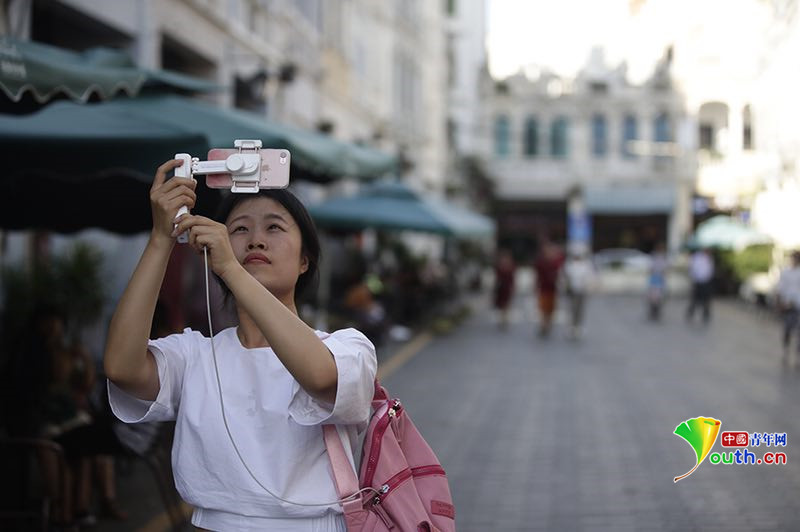人民网记者刘云在骑楼老街进行报道。