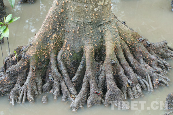 图为大量的螃蟹爬上红树林的树根,据说这种螃蟹是长不大的。