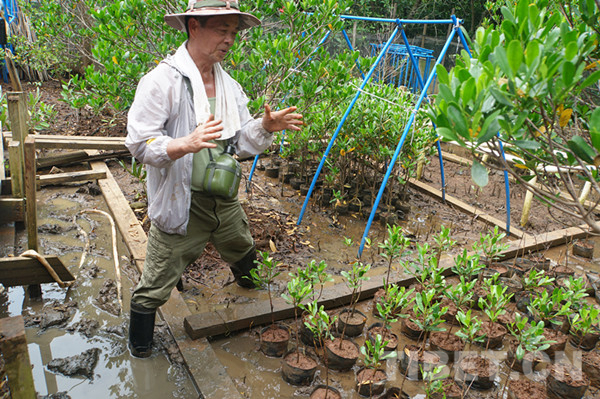 红榄李,属珍稀濒危种,在中国只有9枝母株,现存活在三亚铁炉港。为了保护这种濒危植物,今年62岁的王式军退休后又回到了保护区,培育出700多株新一代红榄李。图为王式军在培育地里管理育苗。