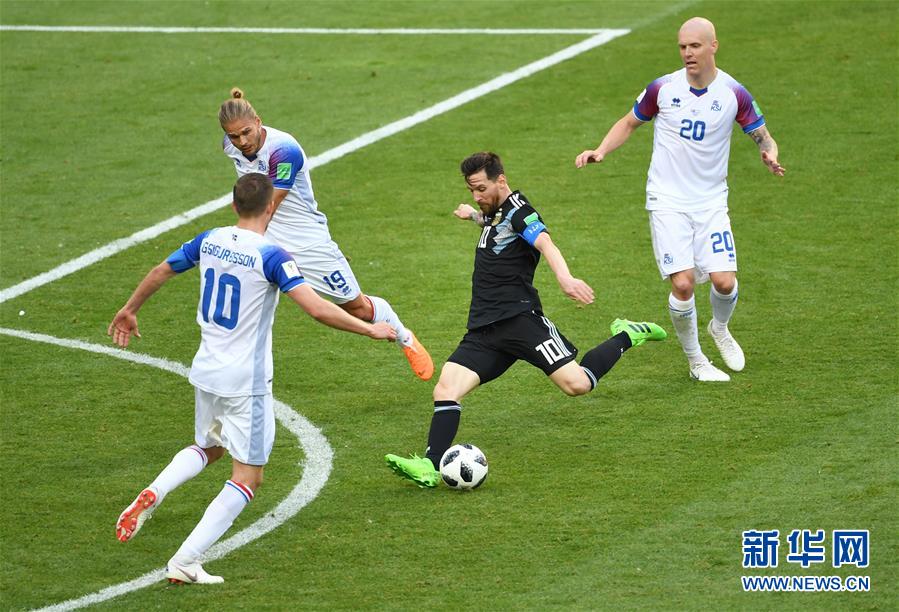 6月16日,阿根廷队球员梅西(右二)在比赛中射门。当日,在莫斯科进行的2018俄罗斯世界杯足球赛D组小组赛中,阿根廷队以1比1战平冰岛队。新华社记者 王毓国 摄