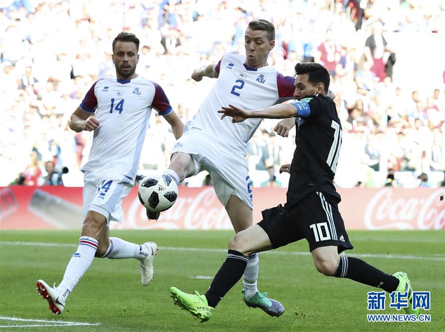 6月16日,阿根廷队球员梅西(右)在比赛中与冰岛队球员塞瓦松(中)拼抢。当日,在莫斯科进行的2018俄罗斯世界杯足球赛D组小组赛中,阿根廷队以1比1战平冰岛队。新华社记者 曹灿 摄