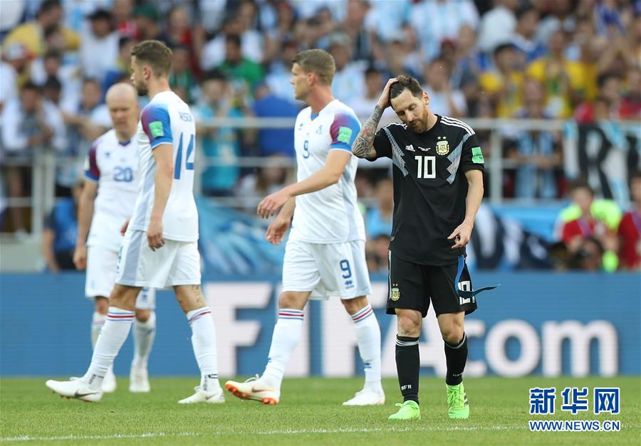 6月16日,阿根廷队球员梅西(右一)在比赛后。当日,在莫斯科进行的2018俄罗斯世界杯足球赛D组小组赛中,阿根廷队以1比1战平冰岛队。新华社记者 徐子鉴 摄